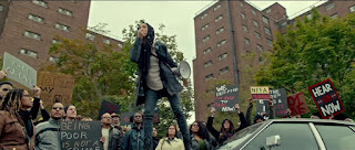 The First Purge vetää alussa aika taitavasti muutamalla kohtauksella nippuun uuden valtiovallan sekä Puhdistuksen taustan; ja sen että vaikka NRA on yhä kuvioissa, niin ei hätää republikaanit – nyt ei syytellä teitä, vaan ”ihan toista” poppoota. Sitten lähiöstä etsitään sieltä täältä päähenkilökandidaatteja, eikä oikein jakseta keskittyä mihinkään. Elokuva hiihtää aika tuttuja latuja kohti alkavaa yötä. Se yrittää löytää uusia kierroksia kaluttuun kuvioon keskittymällä etnisiin vähemmistöihin, mutta sortuu vähän liikaa kliseisiin ja stereotypioihin. Siitä ei millään välity kauhu tulevaa yötä kohtaan, vaan pikemminkin liikutaan epätietoisuuden soissa, mikä on juonen kannalta ymmärrettävää, mutta katsojalle vähän tylsää. Lopulta pitkälti yli puolivälissä leffa uskaltaa vetää vähän uutta korttia (sitä yhtä tiettyä korttia) esiin ja vihdoin yrittää kuvata sitä, minkä katsoja on leffasarjan alusta jo tiennyt – totta kai koko homma on keksitty siksi, että valtaapitävät haluavat harventaa nimenomaan etnisiä vähemmistöjä sekä yhteiskunnan alempaan luokkaan kuuluvien määrää. Mutta ei sitäkään kuvata aiheen vaatimalla otteella. Varsinaiseen yhteiskuntakritiikkiin tarvittaisi paljon rohkeampaa ohjaajaa ja käsikirjoitusta, jotka uskaltaisivat ravistella rakennelmia, eivätkä yrittäisi tehdä pelkkää viihdettä. Okei, moderni KKK ratsastaa moottoripyörillä ja natsisetä tulee kaasunaamari päässä kimppuun, mutta ei se hirveästi vavahduta tai ravista. Nämäkin ovat vain uusia antagonisteja, sen sijaan, että niiden kautta sanottaisi jotain yhteiskunnallisesti merkittävää. Kuvat kyllä tuovat mieleen viimeaikaiset kammottavat joukkoammuskelut Jenkeissä, mutta siihen se vähän jää. Alkaa tuntua siltä, että käsikirjoittaja DeMonaco on vahingossa osunut mielenkiintoiseen aiheeseen, mutta ei osaa tai uskalla hyödyntää sitä. Kaivattaisi David Fincheriä, Danny Boylea, Darren Aronofskia – tai vaikka Jordan Peeleä.